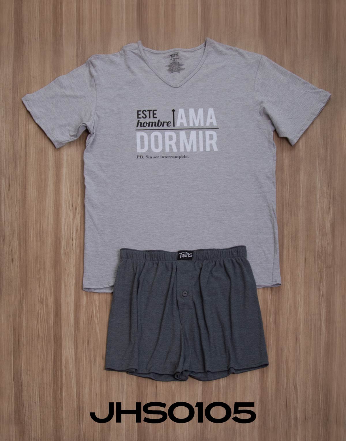 Pijama para hombre con short, modelo JHS0105, playera cuello V con impresión “ESTE HOMBRE AMA DORMIR sin ser interrumpido” y short en tejido plano