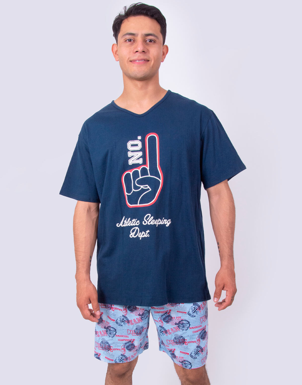 Pijama para hombre bermuda modelo jhb0158. Corte amplio con jareta ajustable, playera manga corta y cuello V, en fresco algodón, con impresión “ATHLETIC SLEEPING DEPT” y tela tejido circular (tipo playera).