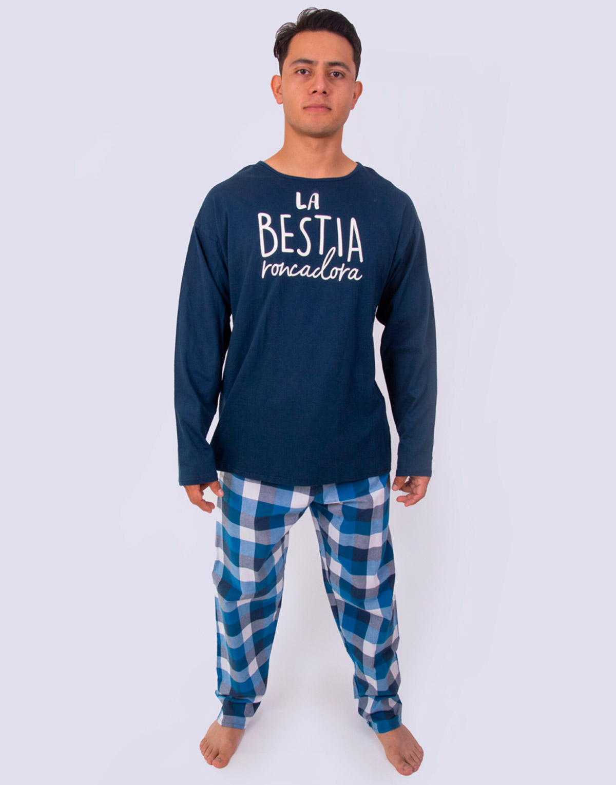 Pijama para hombre de invierno modelo JHI0271 “LA BESTIA RONCADORA” – Pantalón en franela algodón con jareta ajustable. Playera manga larga cuello redondo de algodón peinado.