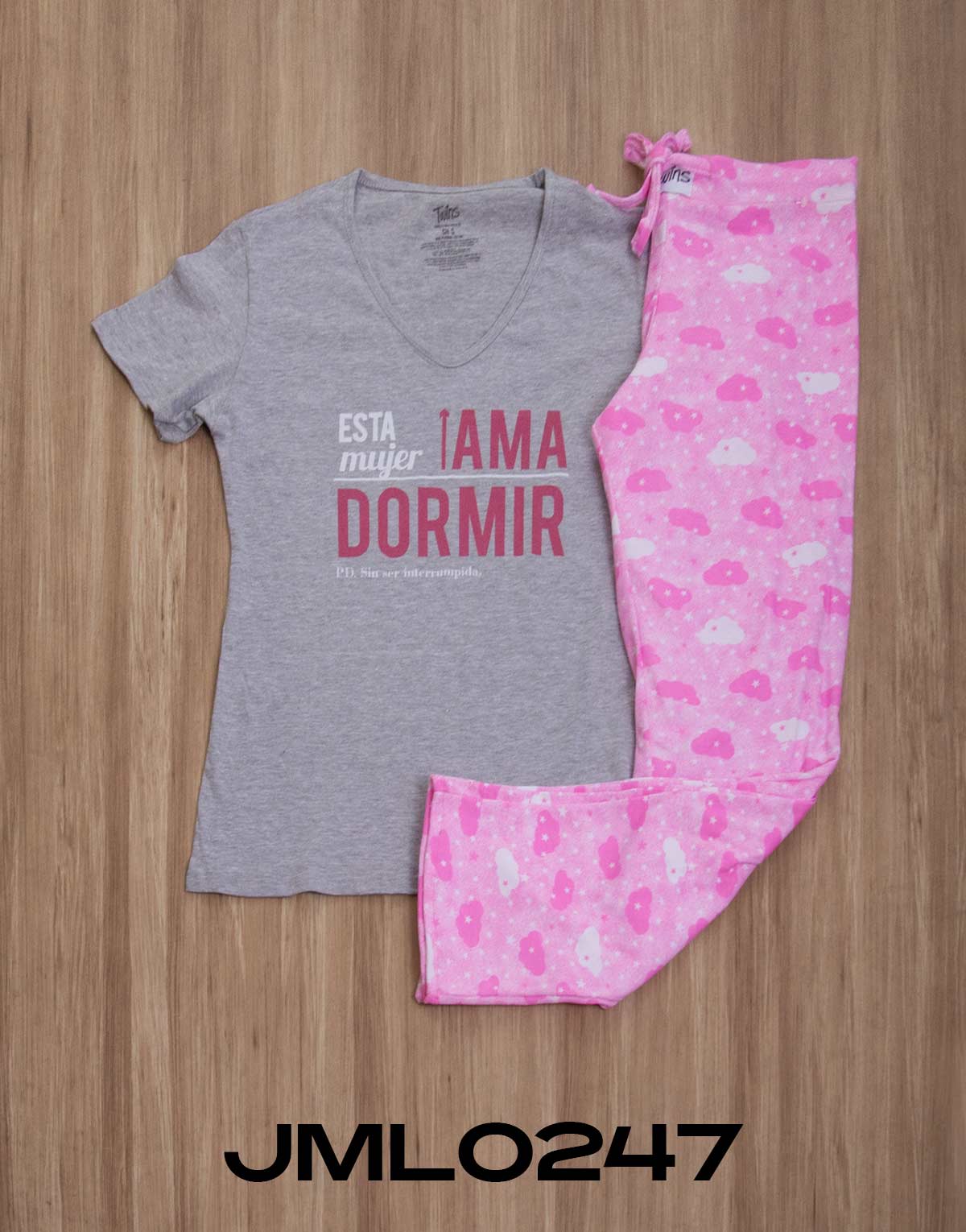 Pijama mujer pantalón modelo JML0247 con playera manga corta con impresión “ESTA MUJER AMA DORMIR SIN SER MOLESTADA”, fabricada con fresca tela de algodón. Pantalón en tejido circular (estira), con jareta en cintura para ajustar y elástico en parte posterior, corte amplio, cómodo y fresco.