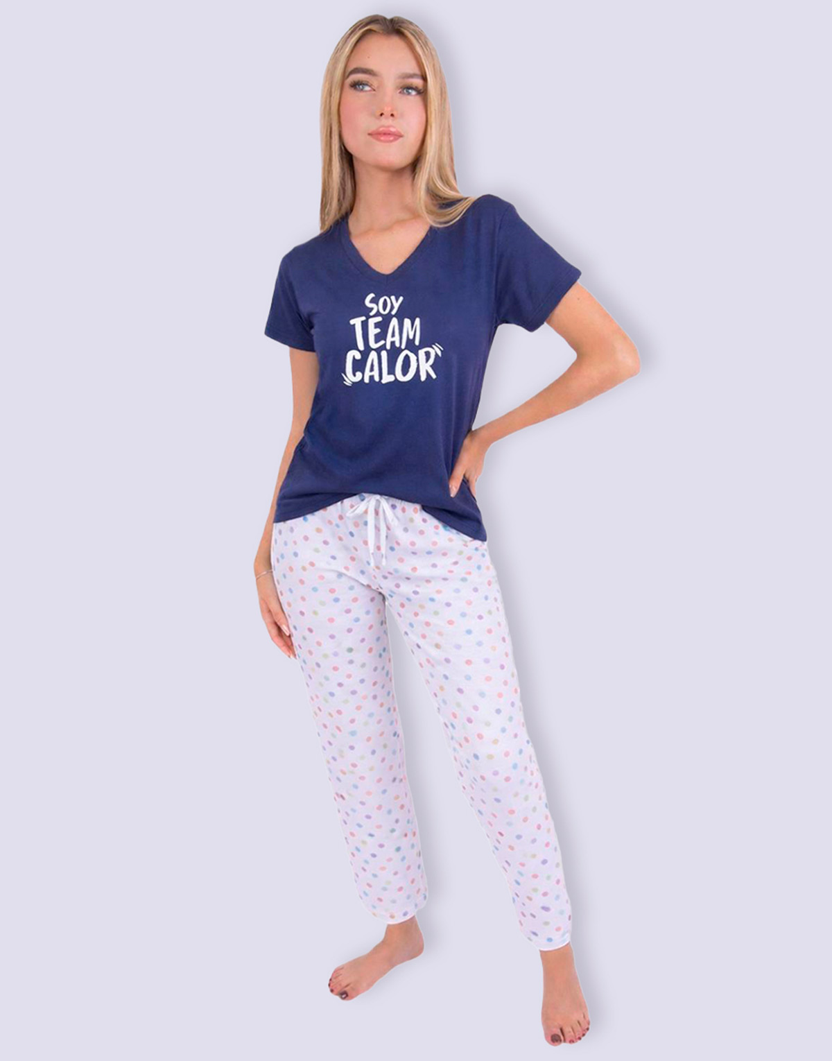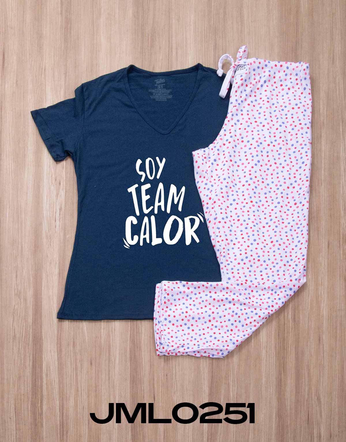 Pijama mujer pantalón modelo JML0251 con playera manga corta con impresión “SOY TEAM CALOR”, fabricada con fresca tela de algodón. Pantalón en tejido circular (estira), con jareta en cintura para ajustar y elástico en parte posterior, corte amplio, cómodo y fresco.