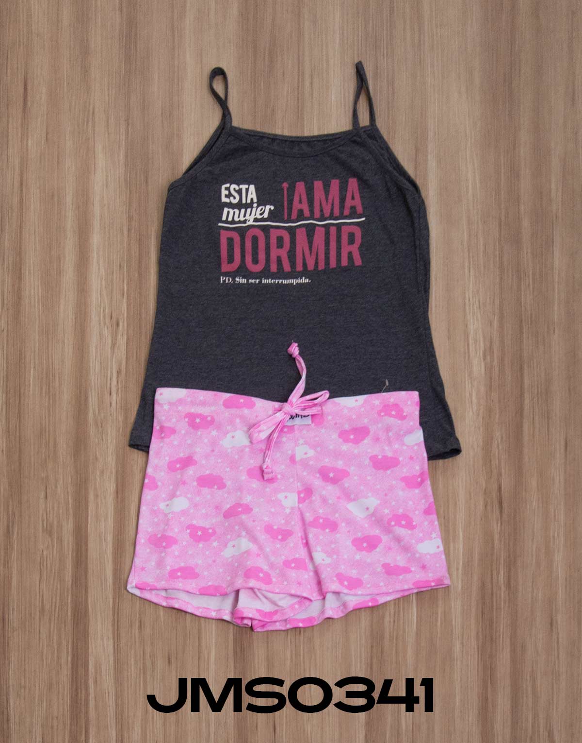 Pijama para mujer short modelo JMS0341 con playera de tirantes con impresión “ESTA MUJER AMA DORMIR SIN SER MOLESTADA” fabricada con fresca tela de algodón. Short en tejido circular (estira), con jareta en cintura para ajustar y elástico en parte posterior, corte amplio, cómodo y fresco.