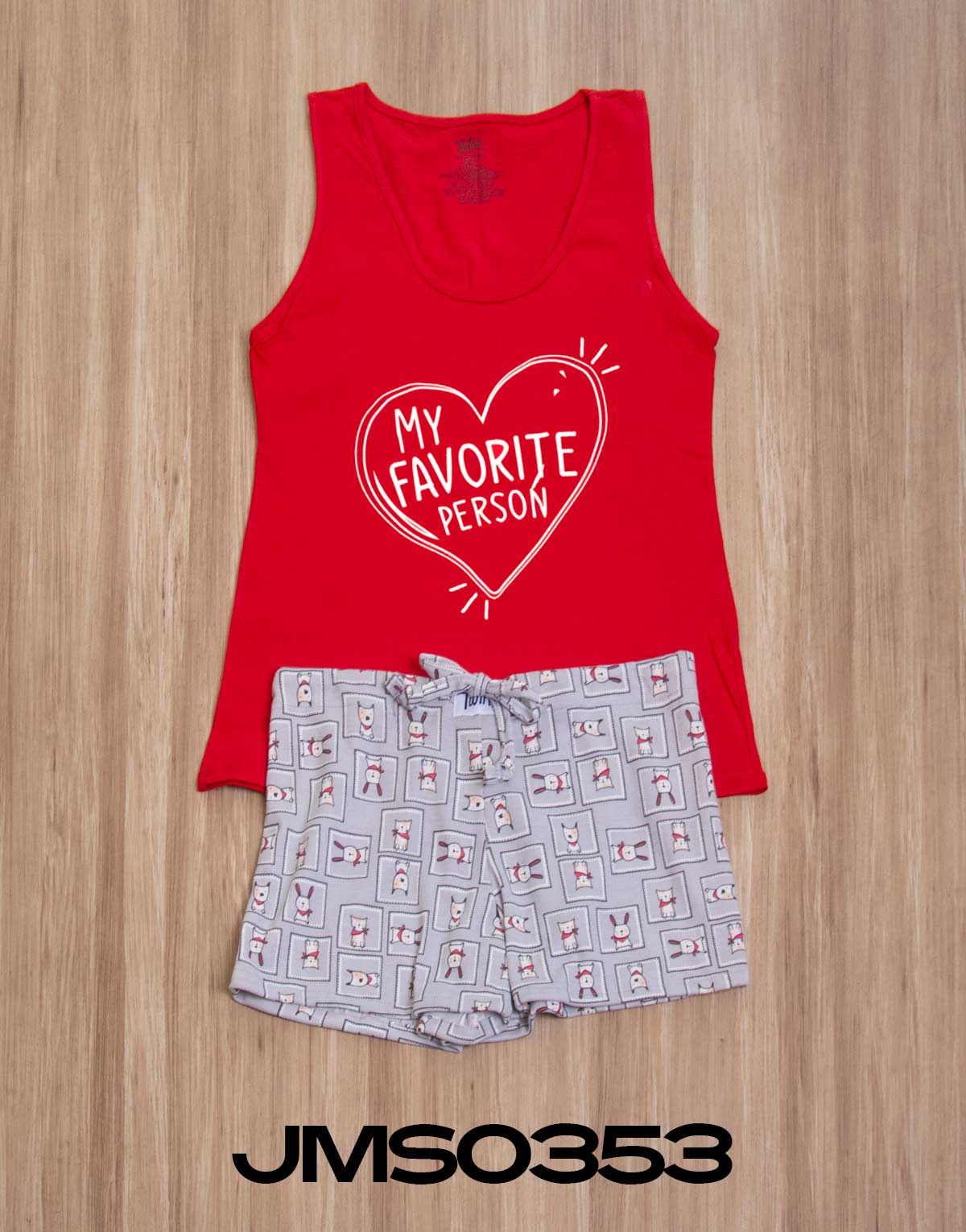 Pijama para mujer short modelo JMS0353 con playera sin manga con impresión “MY FAVORITE PERSON” fabricada con fresca tela de algodón. Short en tejido circular (estira), con jareta en cintura para ajustar y elástico en parte posterior, corte amplio, cómodo y fresco.