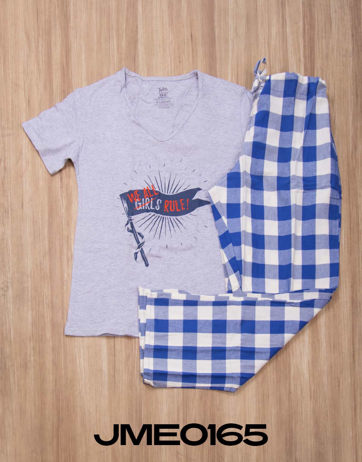 pijama para mujer invierno manga corta modelo jme0165 “we all grils rule”. pantalón de franela algodón con jareta ajustable y playera de manga corta de algodón.
