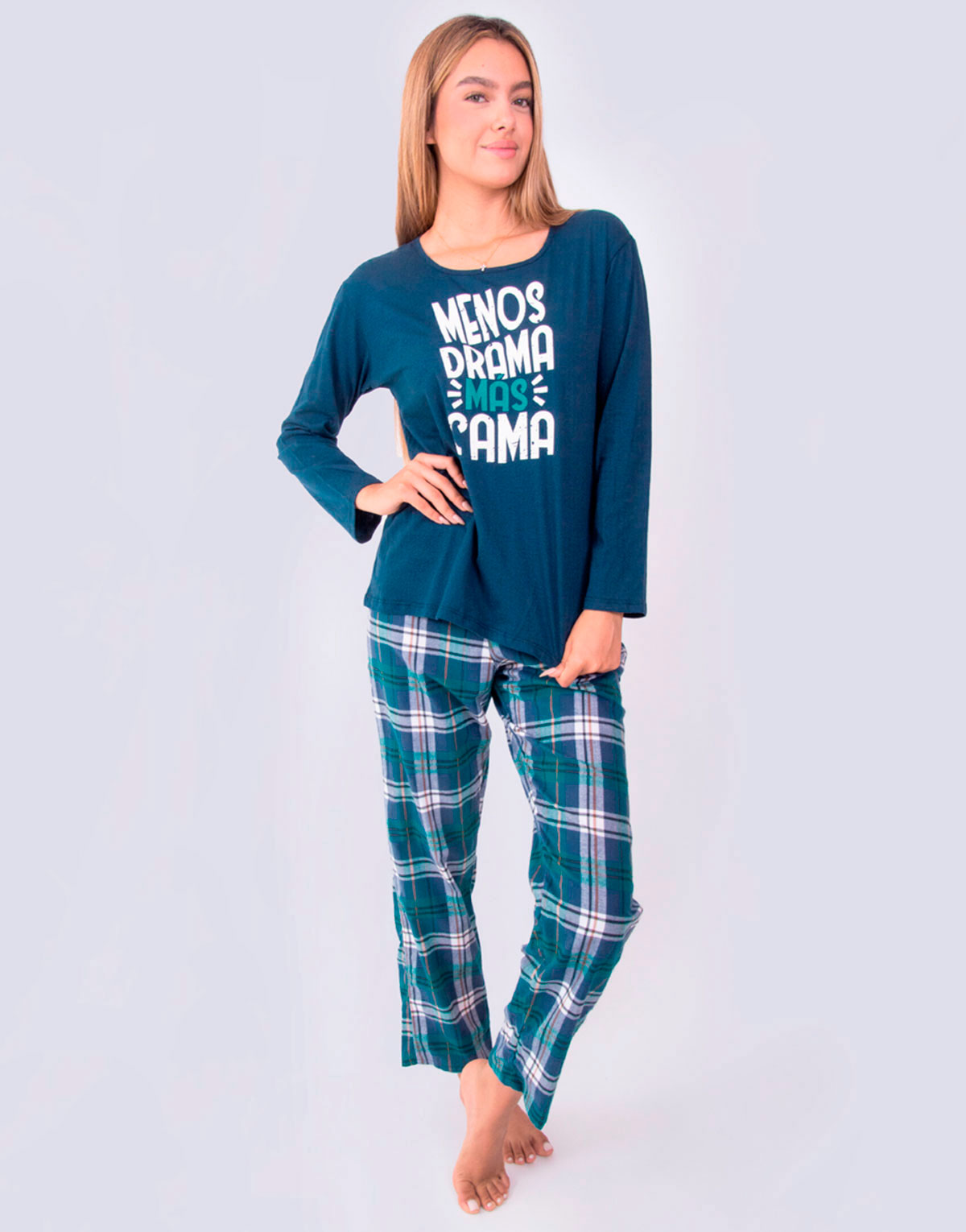 Pijama mujer invierno modelo JMI0327 “MENOS DRAMA MAS CAMA” con playera manga larga y pantalón en franela, jareta en cintura para ajustar, elástico en parte posterior, corte amplio y cómodo.