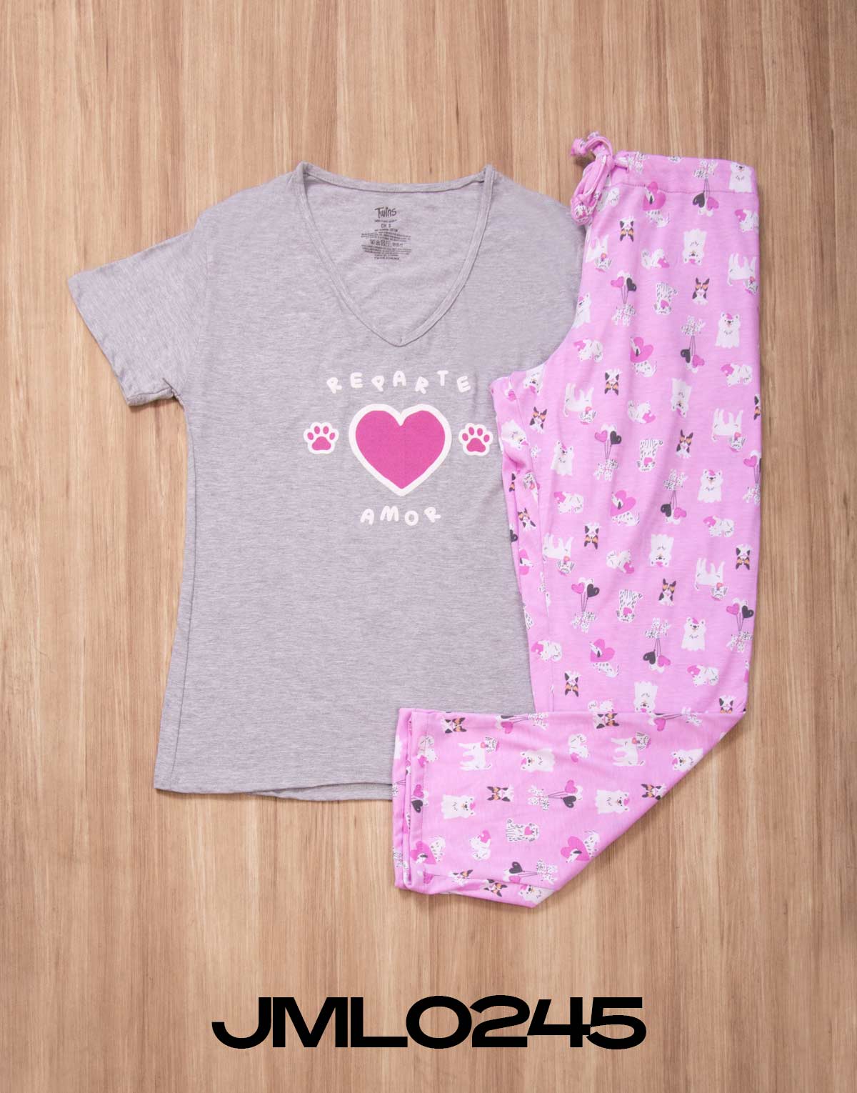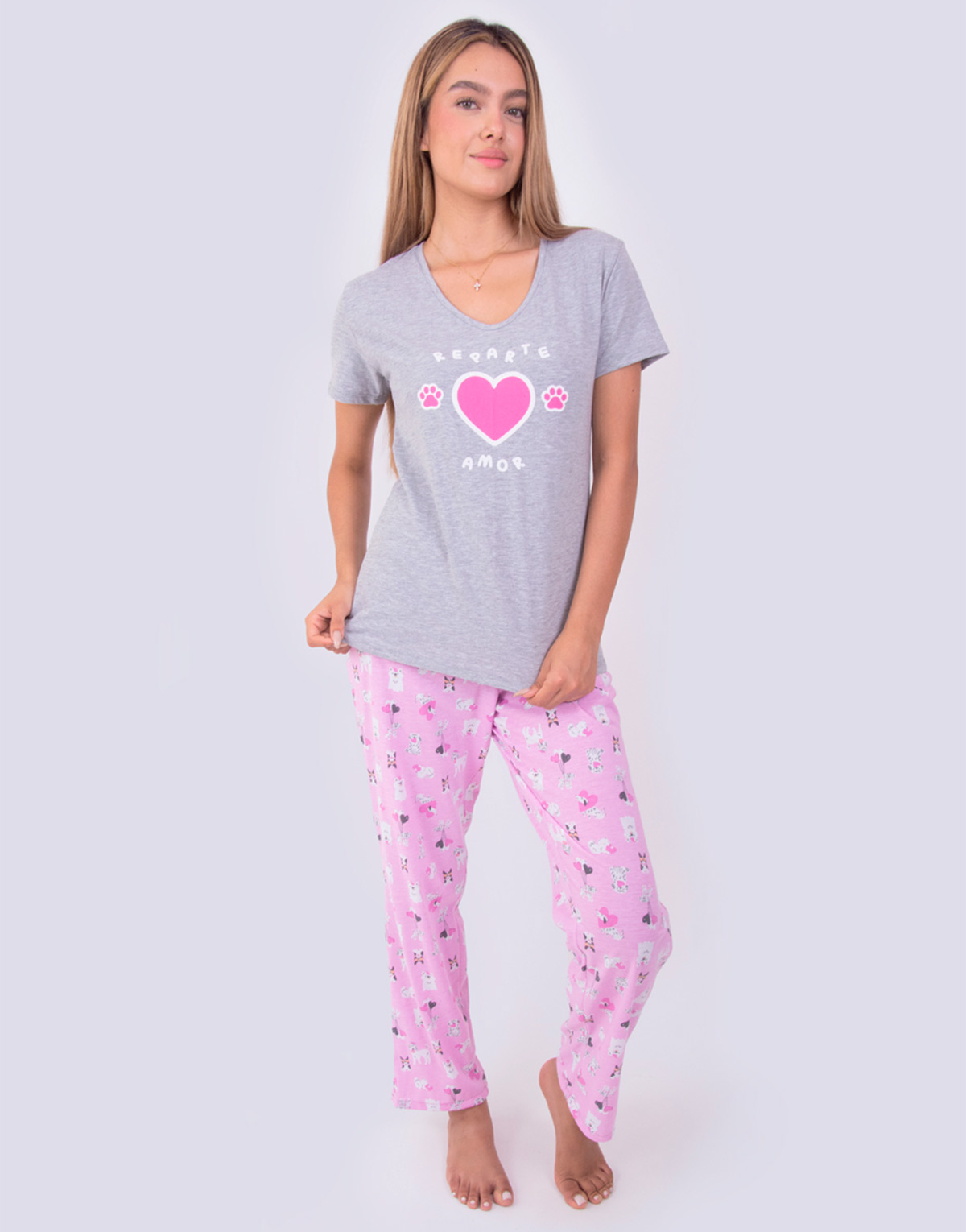 Pijama mujer pantalón modelo JML0245 con playera manga corta con impresión REPARTE AMOR, fabricada con fresca tela de algodón. Pantalón en tejido circular (estira), con jareta en cintura para ajustar y elástico en parte posterior, corte amplio, cómodo y fresco.